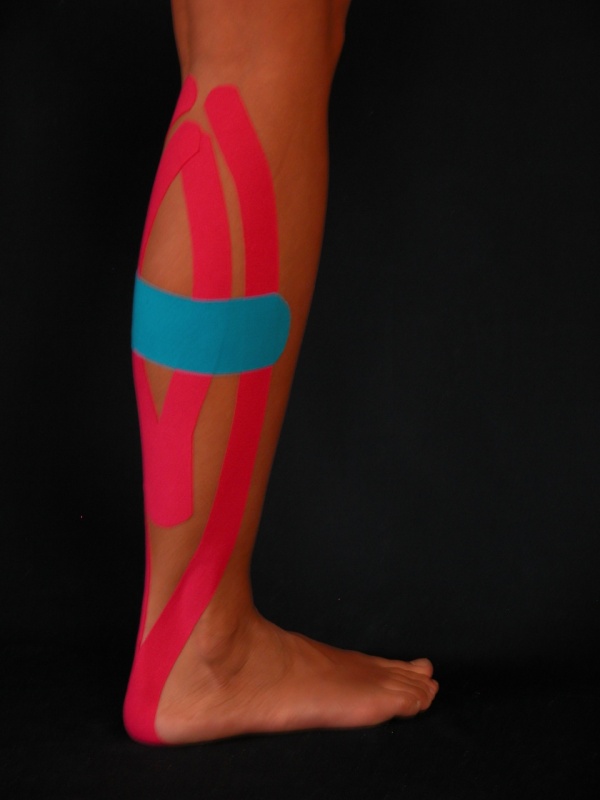 Для этой аппликации Вам понадобится помощник. Отрежьте полоску кинезио тейпа длиной 25-30 см и разрежьте верхнюю часть полоски пополам, сделав таким образом Y-образную аппликацию. Отведите ногу назад, напрягая таким образом мышцы голени, и наклейте Y-образную аппликацию без натяжения, начиная с нижней части голени и обводя Y-образными концами верхнюю часть голени с двух сторон.